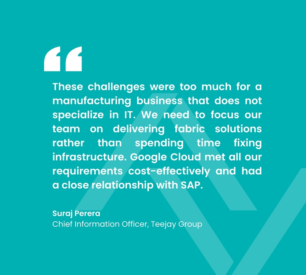 "With SAP on Google Cloud, we are well positioned to execute our plans to grow into new markets," concludes Suraj Perera, CIO Teejay Group. "The biggest benefit is the comfort we have knowing that a business of the caliber of Google Cloud is looking after back-end infrastructure, such as storage and networking, while we focus on becoming the preferred fabric provider for brands worldwide."