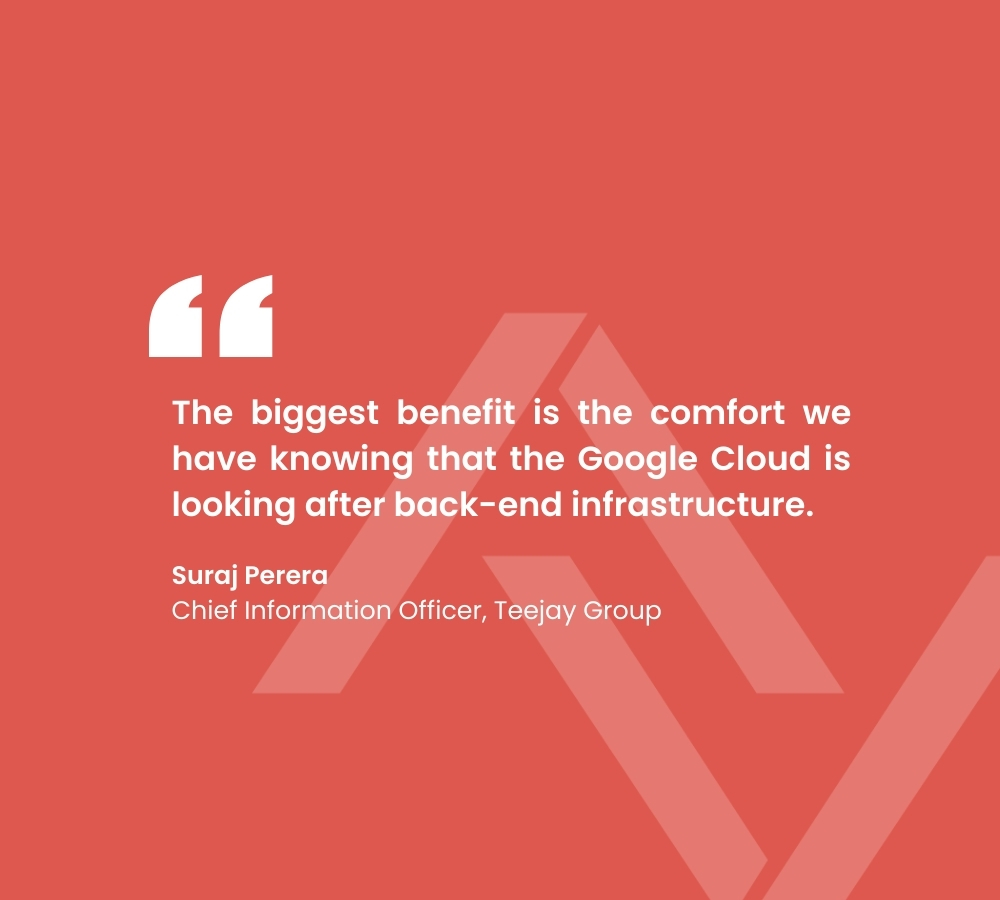 Google AI for Security also provides powerful protection against what Suraj Perera, CIO Teejay Group, describes as a "fast evolving threat landscape." "With Google Cloud, we can trust that this is taken care of, rather than having to invest in security tools and ensure upgrades are completed," he explains.